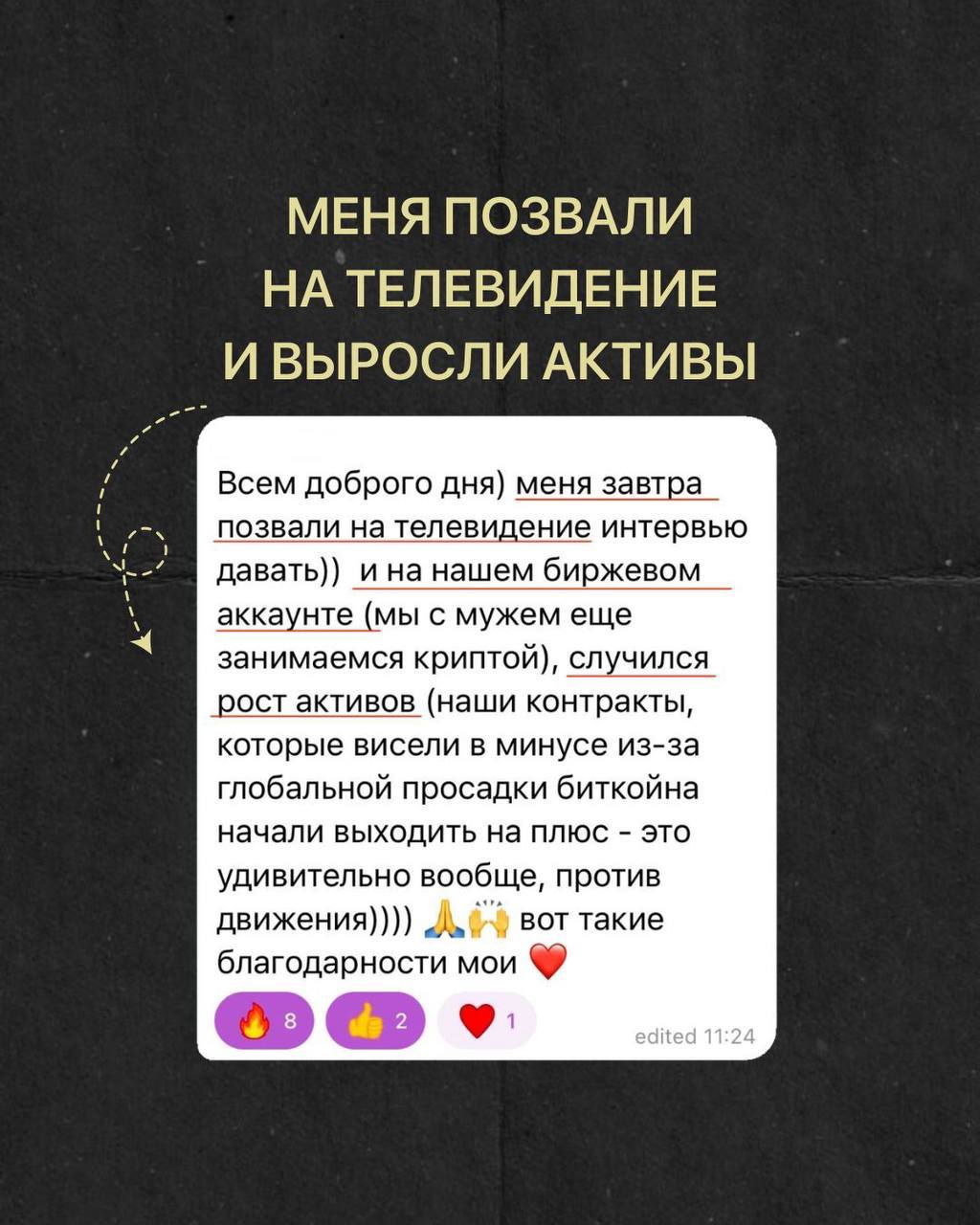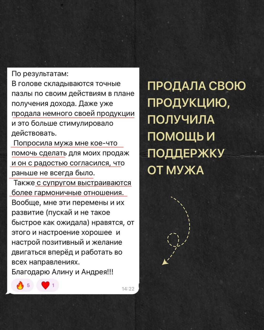 50% кейсов — в бизнесах. Рост оборота в бизнесе на 30% до 32 млн руб., рост чистой прибыли в 5 раз, получение заявок в работу на 350 млн руб. в самый неудачный месяц для рынка недвижимости, покупка квартир, закрытие долгов на 2 млн руб., похудение на 20 кг, избавление от аллергии, счастливые отношения